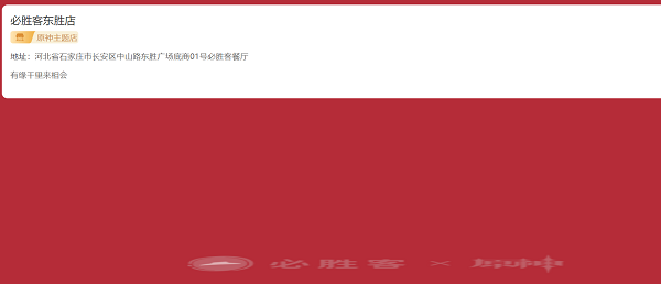 1.必胜客东胜店地址 :河北省石家庄市长安区中山路东胜广场底商01号必胜客餐厅 ,原神旅行者可提前加入主题店微信群实时掌握门店动态哦。必胜